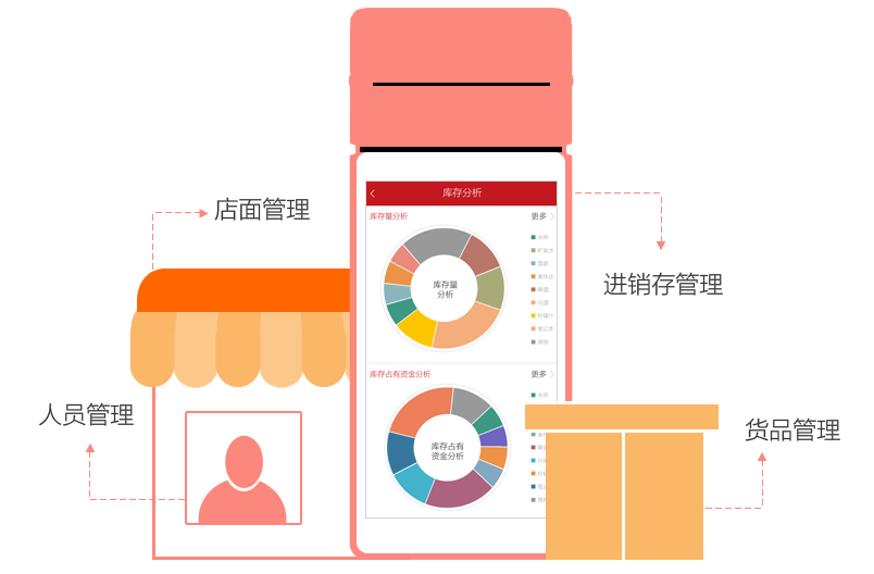 惠商+智能pos自带的进销存系统是一款管理进货、销售、仓库管理、营业数据分析统计的